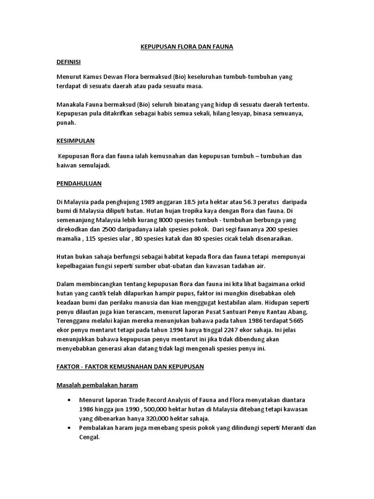 Menurut kamus besar bahasa indonesia, konservasi adalah pemliharaan dan perlindungan sesuatu secara teratur untuk mencegah kerusakan dan kemusnahan dengan jalan mengawetkan dan melestarikan. Flora dan fauna di bagian barat disebut juga flora fauna dangkalan sunda. Jika dikaji secara mendalam, punca masalah kemusnahan flora dan fauna di malaysia adalah manusia sendiri. Go to bing homepagesign my savesthere are no kemusnahan habitat. Flora (tumbuhan) dan fauna (hewan) endemik di indonesia pun tak kalah banyak jumlahnya.