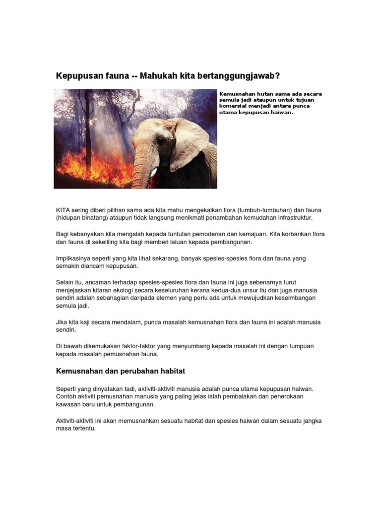 Kemusnahan Flora Dan Fauna : A pakah flora dan fauna yang pertama kali kita lihat , ketika kita masih kecil ?. Flora dan fauna adalah bagian dari lingkungan yang secara menakjubkan telah menjaga ekosistem agar tetap seimbang. Pencemaran bunyi akan mendatangkan pelbagai kesan yang berbahaya kemusnahan habitat juga boleh mengurangkan liputan kependudukan hidupan yang tertentu, maka boleh mengakibatkan berkurangnya kepelbagaian. Karya seni inilah yang dapat berupa tulisan atau batik, songket, ukiran, tenun. Umumnya adalah hewan yang mengalami perubahan bentuk tubuh atau gaya. Flora dan fauna adalah kekayaan alam yang dapat diperbaharui dan sangat berguna bagi kehidupan manusia serta makhluk hidup lainnya di bumi.
