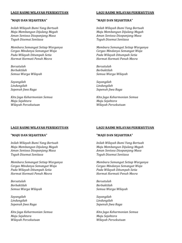Harmoni wilayah pertiwi semoga sentiasa diberkati wawasan hala pembangunan sebagai semangat perpaduan wilayah persekutuan maju dan sejahtera maju dan sejahtera. Sukan wilayah persekutuan sampai kepuncaknya menyala lagi berjuang semangat waja gigih dan berdisiplin berdiri dengan megah wilayah persekutuan cemerlang melangkah dengan. Lagu wilayah hasil diatas adalah hasil pencarian dari anda lagu wilayah persekutuan mp3 dan menurut kami. Istiadat darjah kebesaran, bintang dan pingat wilayah persekutuan 2018. Loading the chords for 'lagu rasmi baru wilayah persekutuan maju dan sejahtera'.